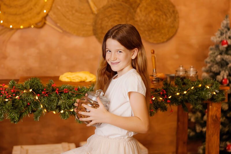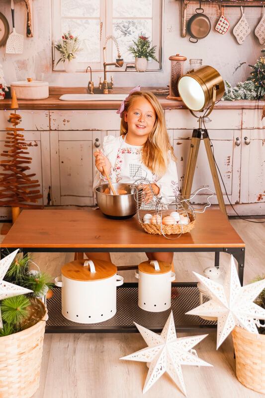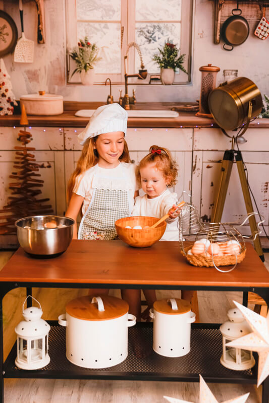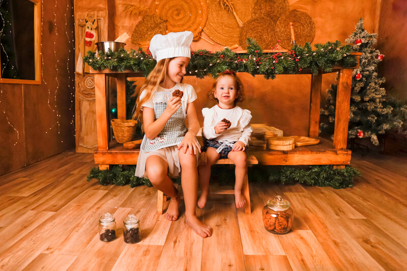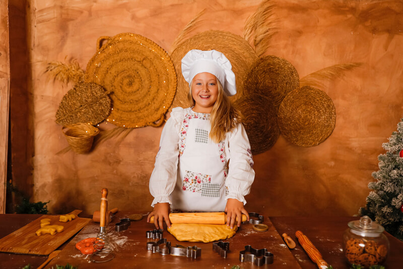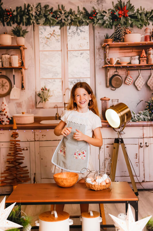 Contamos con delantales, gorros de chef, moldes, utensilios de cocina, rodillos de madera y muchos detalles navideños para que los peques jueguen y participen mientras hacemos la Sesión Fotos Navidad Valencia. Todo está preparado para que vivan una experiencia divertida y entrañable.