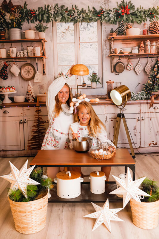 Recomendamos coordinar los colores: blanco, beis, rojo, verde o dorado funcionan genial con nuestros escenarios de cocina navideña. Evitad logotipos o estampados grandes. Si queréis, podéis traer un segundo conjunto (no es obligatorio). Y si queréis un recuerdo especial, los pijamas navideños a juego siempre son un acierto.